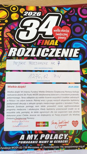 Z radością informujemy, że zakończyliśmy zbiórkę w ramach akcji Wielkiej Orkiestry Świątecznej Pomocy, w której nasze przedszkole wzięło udział w dniach 21–22 stycznia 2026 roku.